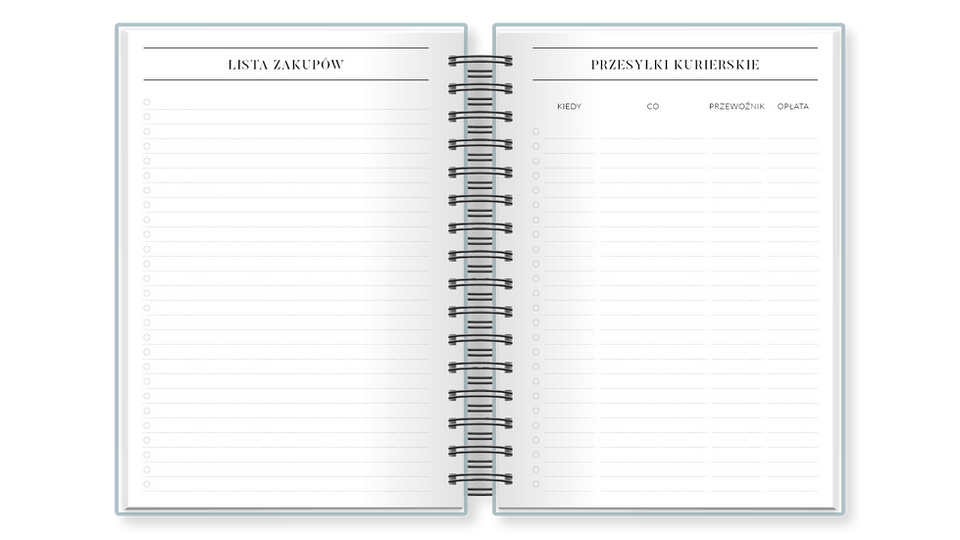 Ty decydujesz o wyglądzie pierwszej strony swojego planera. Mogą być to Twoje wybrane dane lub pusta tabelka do ich wpisania, imię lub ulubiony cytat, albo tylko nasze logo.
